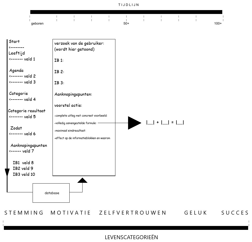 Daarbij heb je twee 2 balken: een tijdlijn (boven) en levenscategorieën (onder). Bevat de ruimte tussen jouw tijdlijn en jouw levenscategorieën bij jou passende formules, dan leef je een optimaal leven, bevat de ruimte formules die slechte invloed op jou hebben, dan kun je hier inzicht in krijgen.
